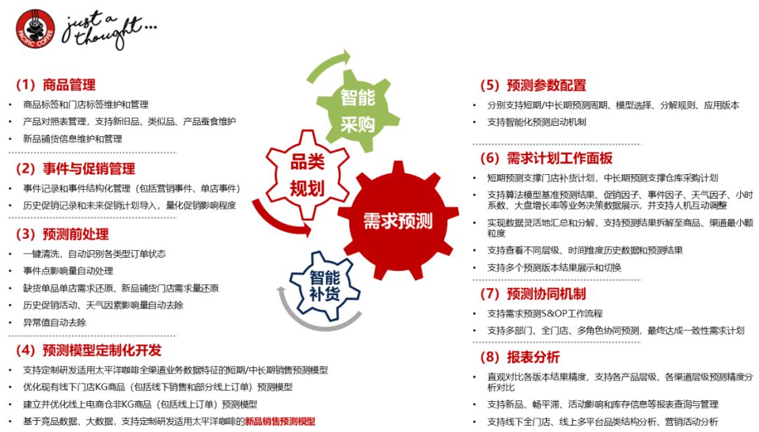 2017年开始,欧睿数据协助太平洋咖啡打造全渠道数字化的智慧供应链:对企业的计划体系进行梳理和重新构建,以消费者画像、店铺画像和商品画像三方面分析刻画为基础,通过大数据算法模型,获取单店单品需求预测结果,动态实时地指导品牌总部补货计划,并形成各门店品类规划和备货计划,并以此驱动后端的具体行动如采购、物流、仓储、人员配置等。整个解决方案包含多个部分:经营计划、商品计划、需求计划、智能补货、运营驾驶舱等。
